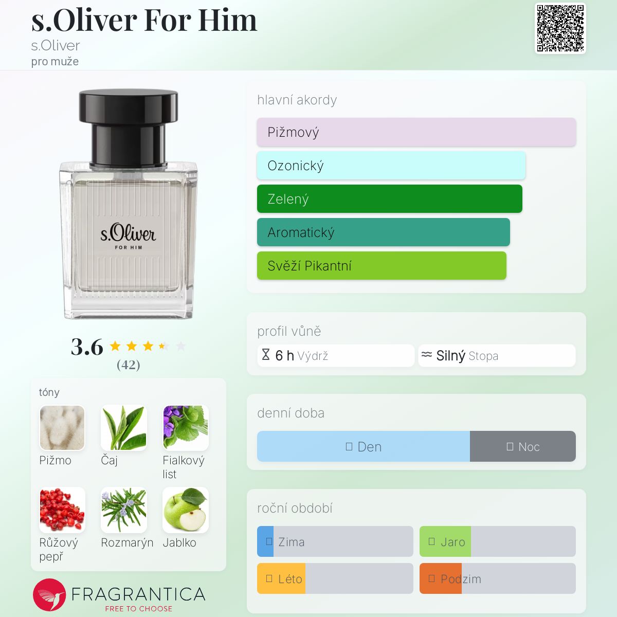s.Oliver For Him podle s.Oliver je Aromatic Fougere vůně pro muže. s.Oliver For Him byl/a uveden/a v roce 2016. Vrchní tóny jsou Černý čaj, Růžový pepř a Jablko; střední tóny jsouFialkový list, Rozmarýn a Pelargónie ; základní tóny jsou Pižmo, Mech a Fazole tonka.