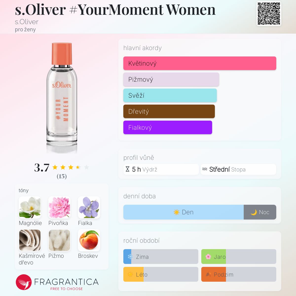 s.Oliver #YourMoment Women podle s.Oliver je Floral Woody Musk vůně pro ženy. s.Oliver #YourMoment Women byl/a uveden/a v roce 2019. Vrchní tóny jsou Broskev a Černý rybíz; střední tóny jsouMagnólie, Pivoňka a Fialka ; základní tóny jsou Kašmírové dřevo, Pižmo a Bavlna.