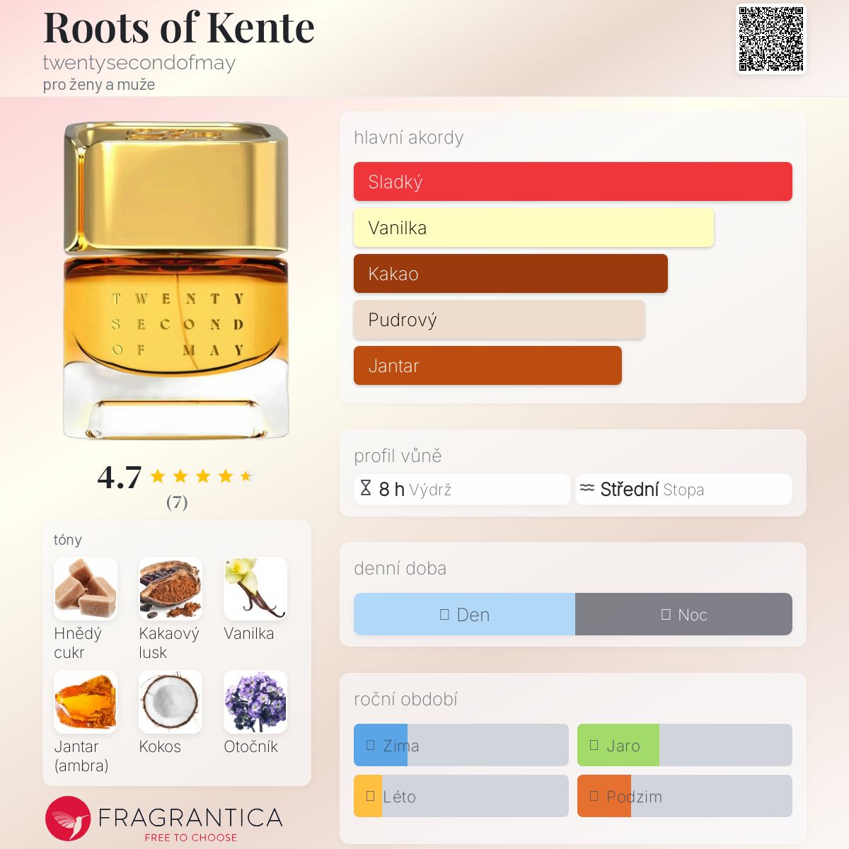 Roots of Kente podle twentysecondofmay je Orientální Vanilla vůně pro ženy a muže. Toto je nová vůně. Roots of Kente byl/a uveden/a v roce 2025. "Nosem" za touto vůní je Joschka Klee. Vrchní tóny jsou Hnědý cukr a Aldehydy; střední tóny jsouKakao, Kokosové mléko, Otočník a Fazole tonka ; základní tóny jsou Vanilka, Jantar (ambra), Indian Sandalwood, Pižmo a Labdanum.