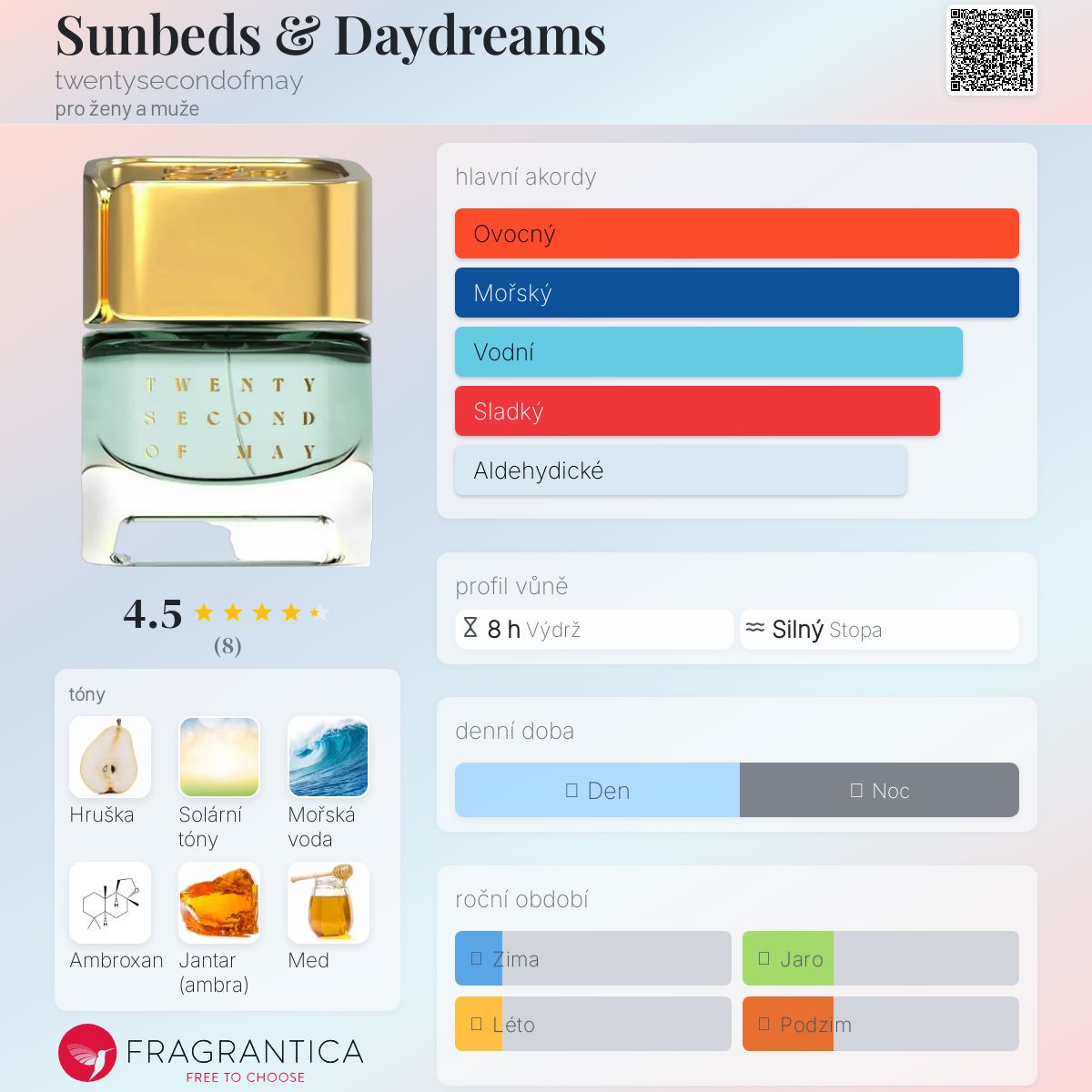 Sunbeds & Daydreams podle twentysecondofmay je Floral Aquatic vůně pro ženy a muže. Toto je nová vůně. Sunbeds & Daydreams byl/a uveden/a v roce 2025. "Nosem" za touto vůní je Alice Le Berre. Vrchní tóny jsou Hruška a Solární tóny; střední tóny jsouMořská voda, Med a Indický jasmín ; základní tóny jsou Ambroxan, Jantar (ambra), Pižmo, Kašmírové dřevo a Agarové dřevo (oud).